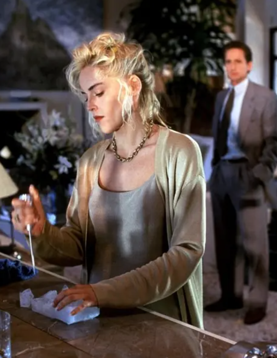 (莎朗·斯通在電影《本能》裡用冰錐把和她睡覺的男人殺死▽)