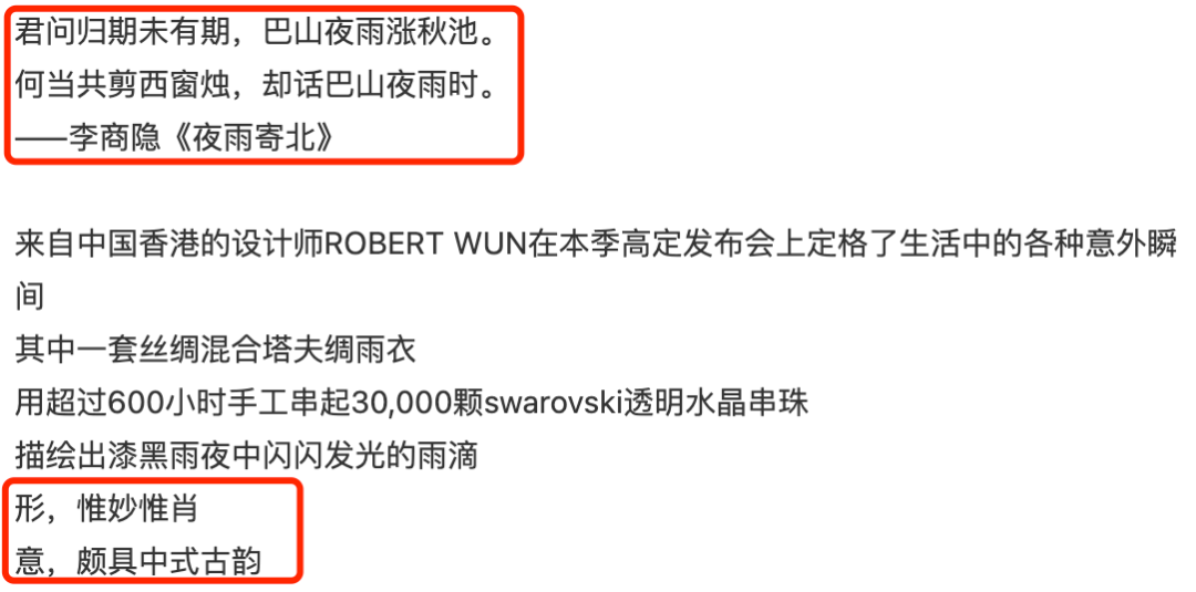 在一些後續的解讀裡,大家也默認它極具古典韻味,加之設計師Robert Wun本身就來自中國香港,看起來這套衣服的靈感內核已經板上釘釘。