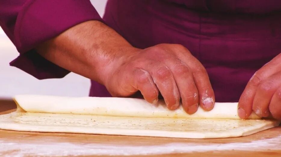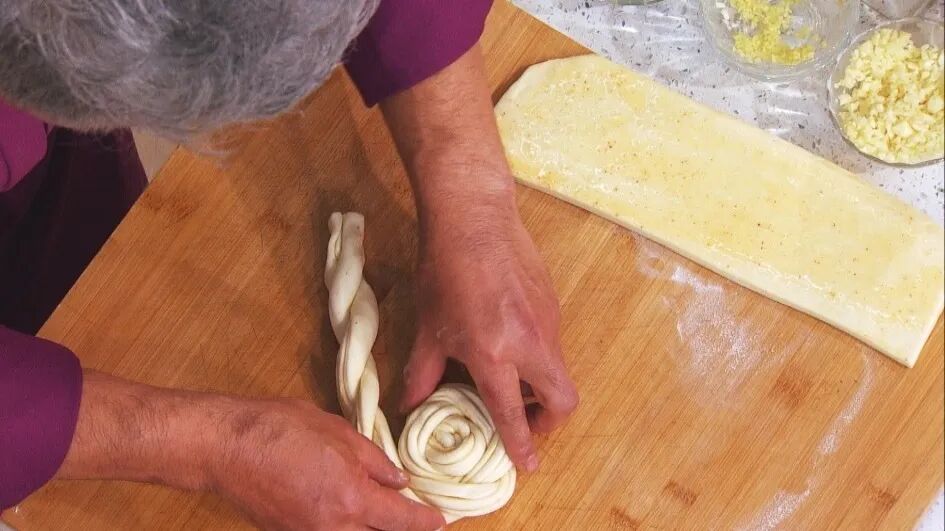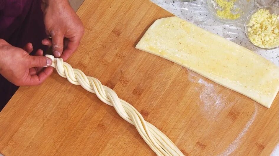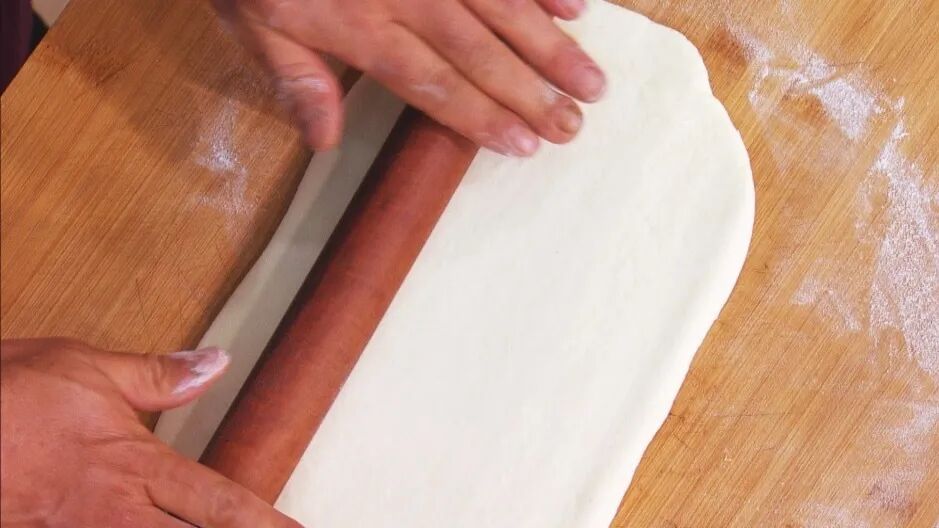 醒發好的麵糰,擀成面片。將油酥均勻抹在面片上,捲成長條封好口。然後從長條中間劃一刀,變成兩根長條,交叉纏繞成“麻繩”。然後捲成大花捲。