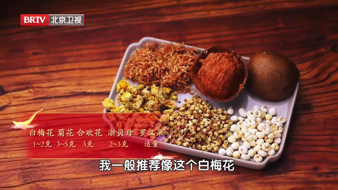 配方:白梅花1-2克、菊花3-5克、合歡花3克、浙貝母2-3克、羅漢果適量