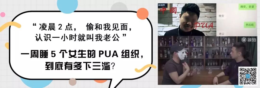 這段被刪除的,令人汗毛豎起來的聊天記錄,以及起底PUA組織的長文,被我的朋友寫盡了一個叫【SHOW範兒】的公號裡,長按二維碼關注,回覆【把妹】,查看全文。這個讓人汗毛豎起來的對話,真的大家一定要看,一定要學會甄別渣男。