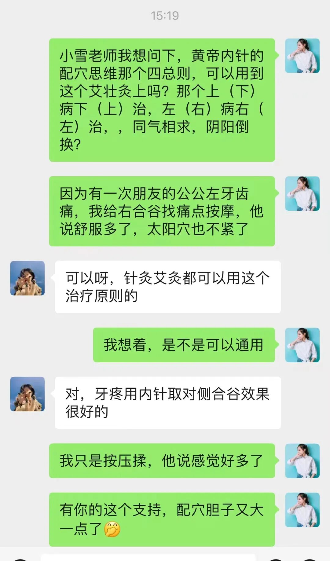 平時朋友在家想給孩子保健調理,會來問我怎麼處理,我會按照我的思路去配穴,不太確定的時候,我會去問助教老師,她們都會很耐心仔細的回覆,於是我膽子也越來越大了,現在迫切想要複訓課,去吸收更多的知識。