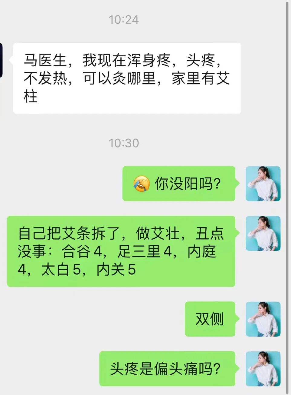這個案例我也覺得過於神奇,鄰居家的孩子著涼咳嗽了,她就問孩子要去醫院打針還是讓朵朵媽媽(我)做下艾灸,孩子說來我家做艾灸,但那天孩子比較抗拒,沒有做成。