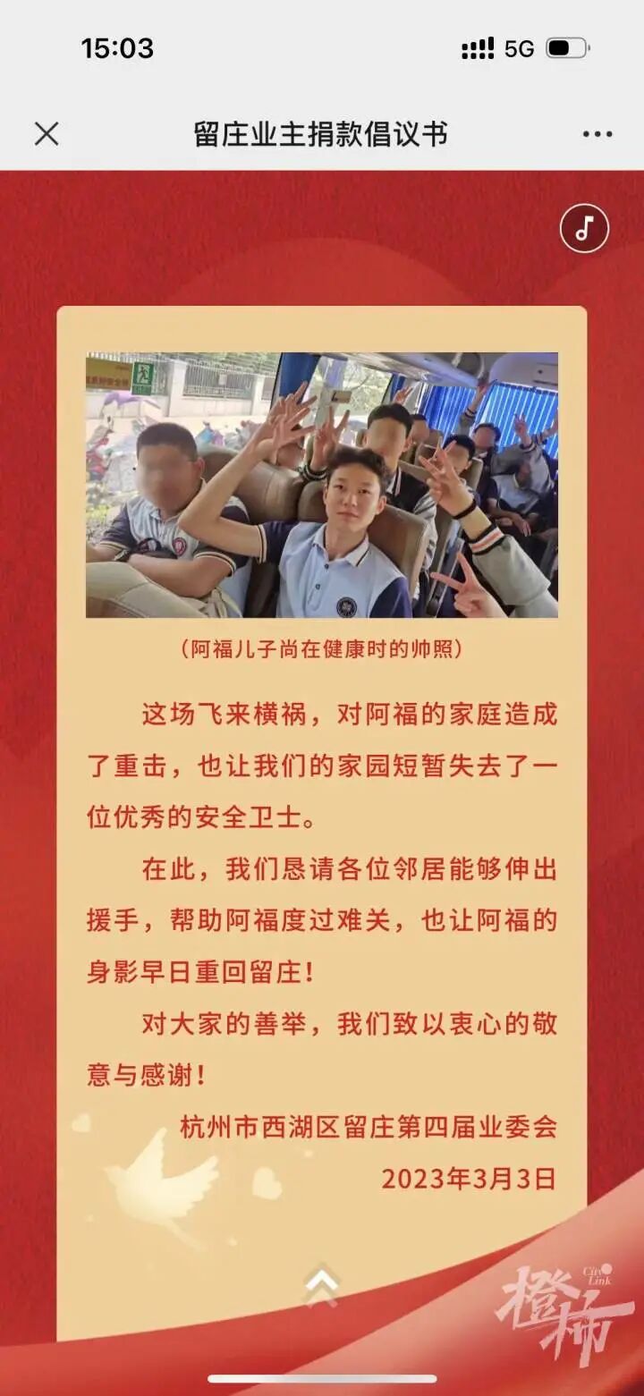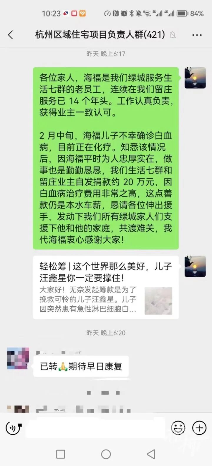 “大家好!我叫汪海福,老家在安徽阜陽農村,在杭州做了14年保安。我的職業最多的就是和人打交道,我比誰都知道,杭州是一座很有溫度的城市。今天,我想跟大家說說我的故事。上個月我兒子被確診了為急性淋巴細胞白血病,還感染了銅綠細菌,我也不懂,但醫生說難。骨髓配對難,治療週期長,還有就是高額的治療費用,跟一座山壓著一樣。但身邊人的無私幫助讓我感動落淚。大家能想到嗎,10天時間,我的同事領導,服務的小區業主們幫我籌集了20萬捐款。這些業主裡,有些人只是臉熟,有些人甚至只是上下樓的時候,我幫忙提過行李,還有些新朋友只是匆匆打過照面。在短短時間內,他們給了我20萬,這是我十年工作才能攢下來的錢。