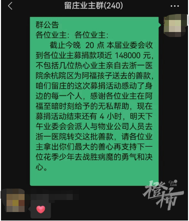 陳建華說,除了發動西湖區綠城物業管理的所有小區捐款,他們同時也會和集團互助會聯繫,看能否在整個區域公司、集團進行募捐。目前這項工作正在推進。“因為前幾天的募捐信息有一些員工可能沒有看到,昨天發的時間也比較晚,現在是10萬塊不到。”