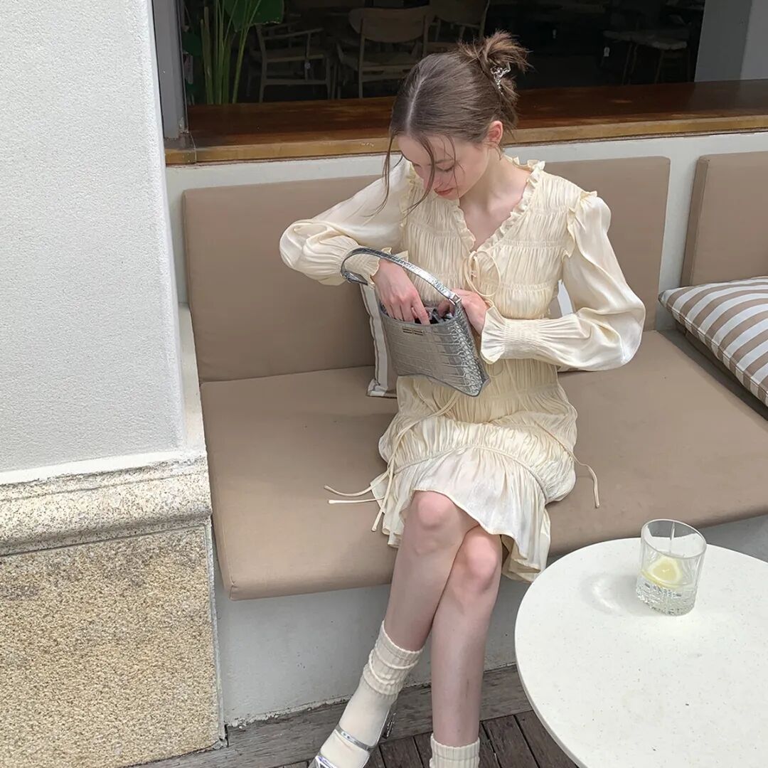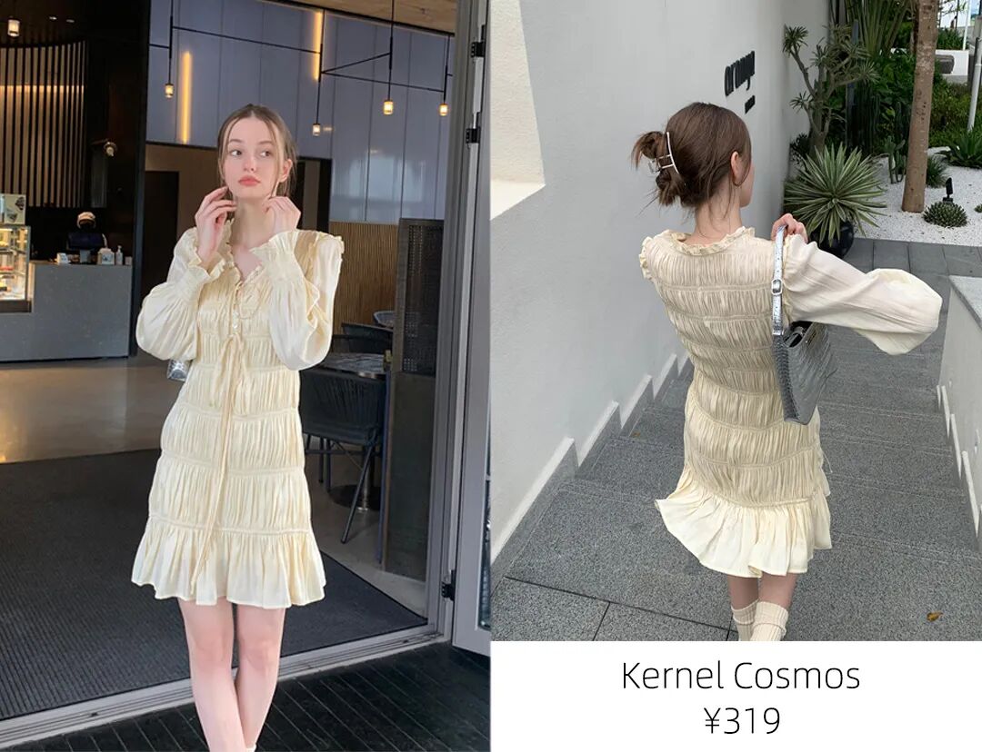 整條裙子都用了褶皺工藝,配上繫帶元素,增添了亮點。是兩件套來著,裡面會幫你搭好吊帶。