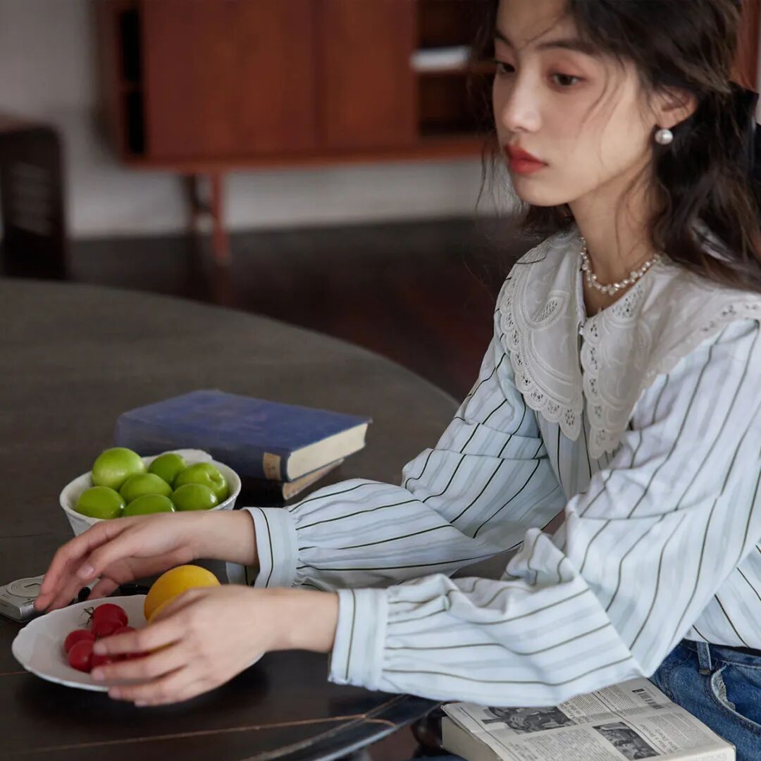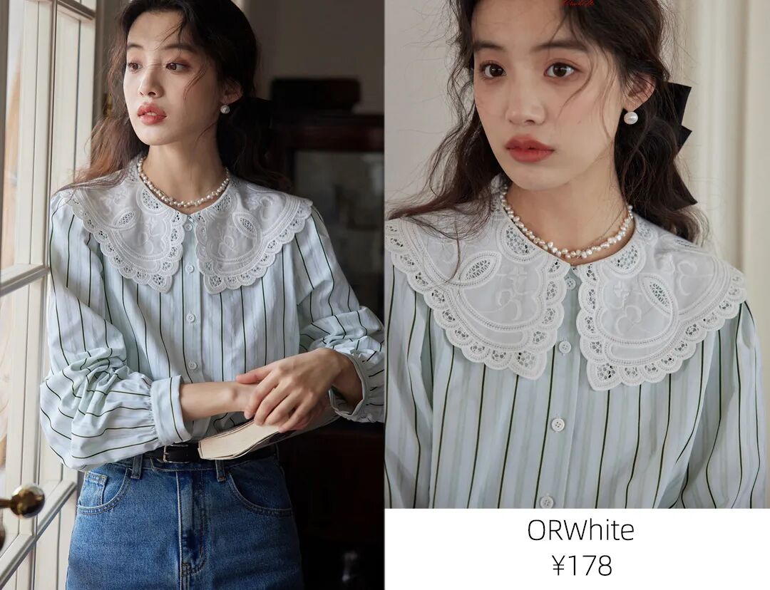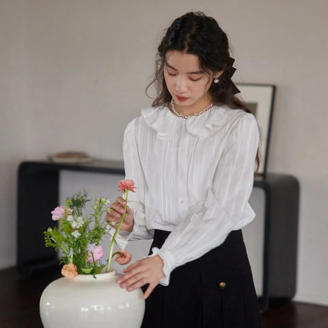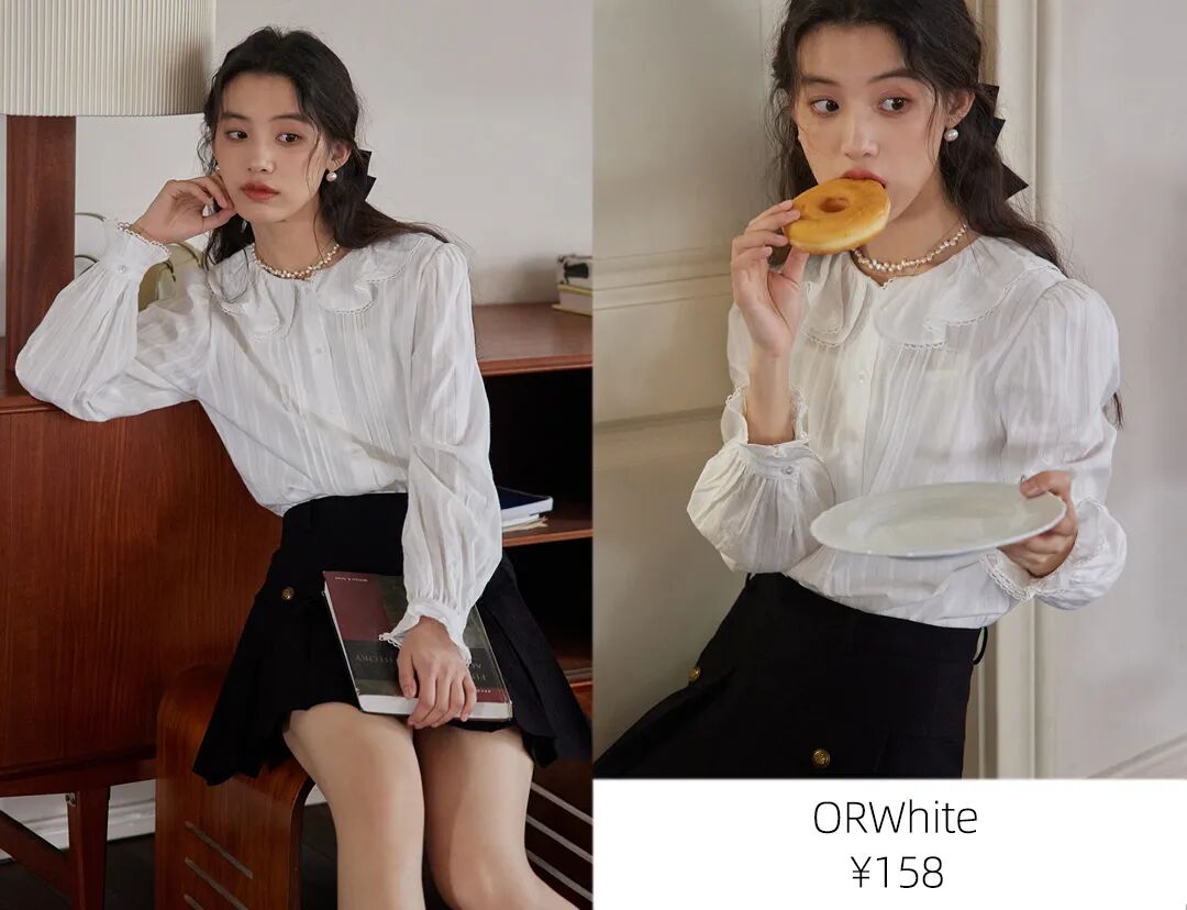 具有清冷氣質的一件襯衫,小圓領月牙花邊,典雅別緻,全棉提花的肌理感浪漫且溫柔。