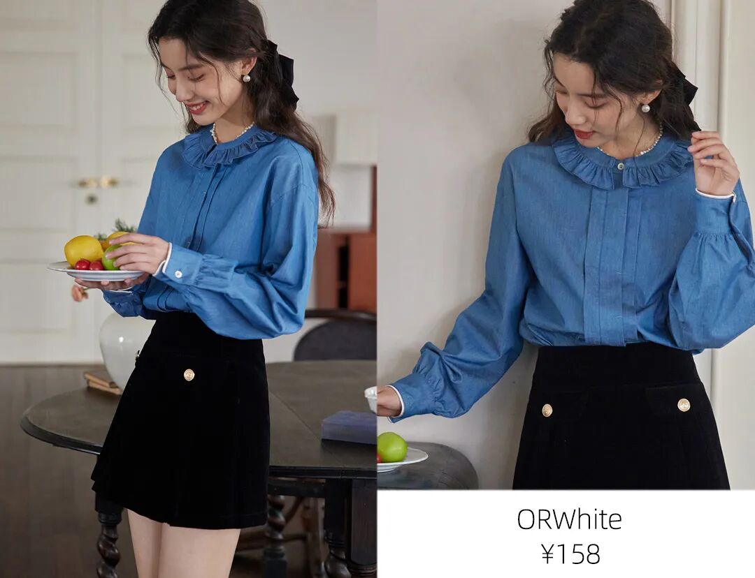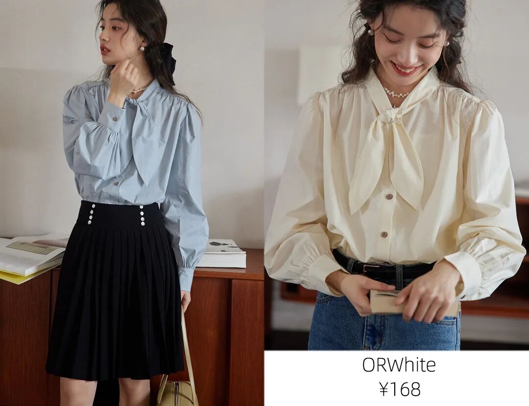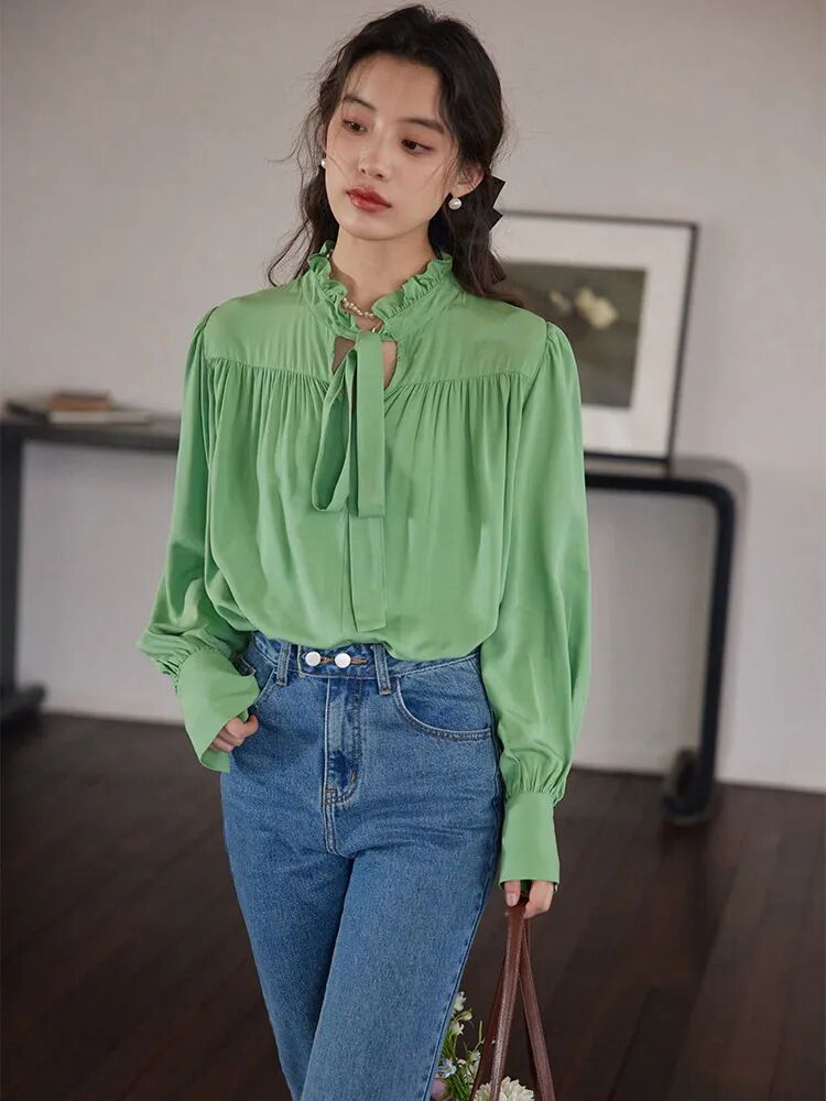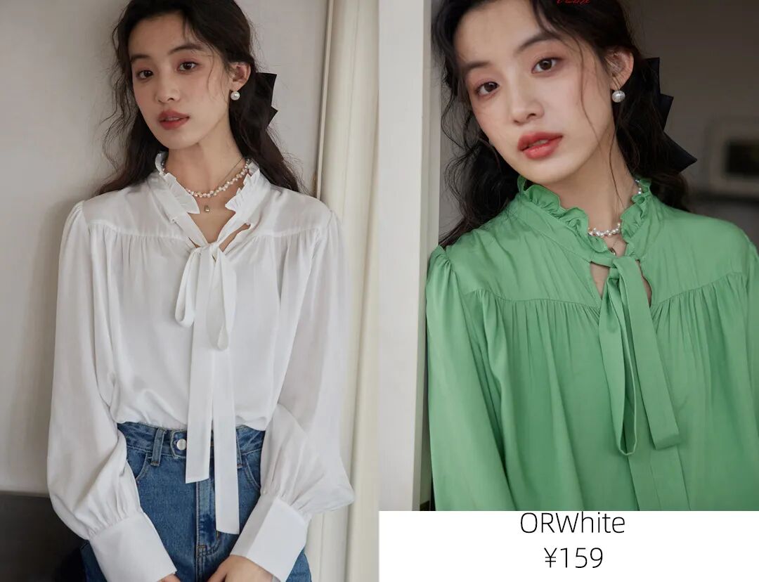 天絲手感的垂墜感襯衫,飄逸且順滑,小立領+木耳邊設計,突出了迷人的頸部線條,配上飄帶隨意系成的蝴蝶結,優雅又不失甜美。