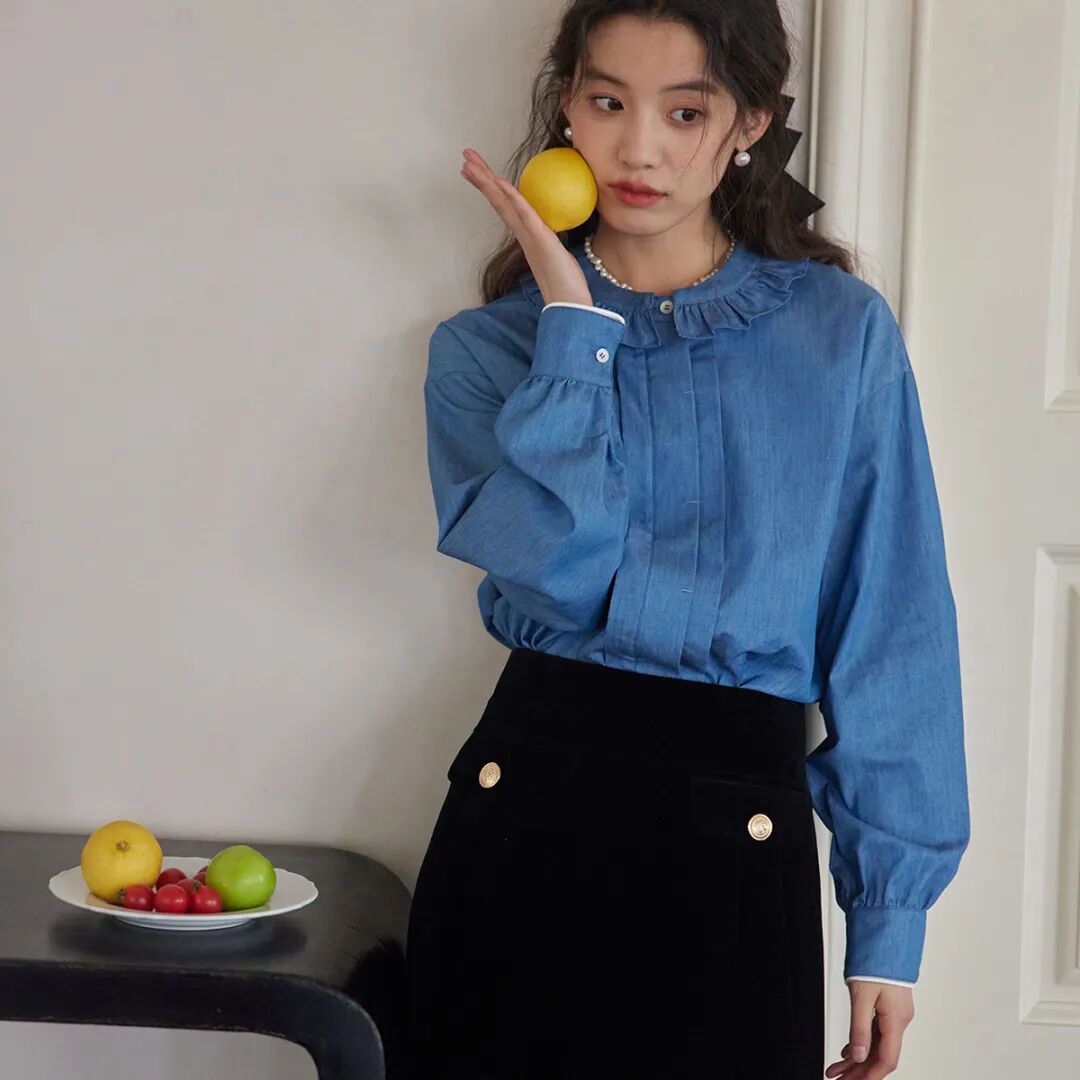 水洗牛仔面料親膚柔軟還自帶挺闊度,厚度適中不悶熱。雙層門襟的設計讓衣身更加有層次,袖口還做了白色織帶,細節滿分。