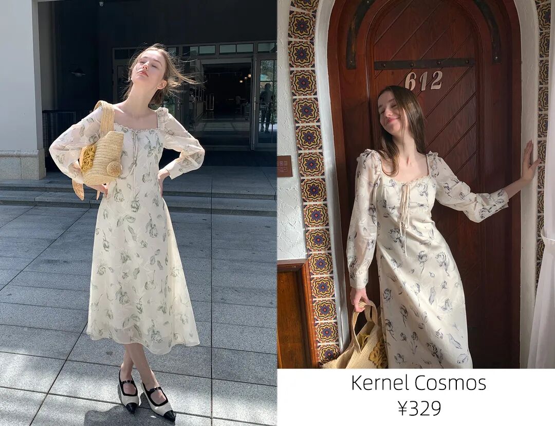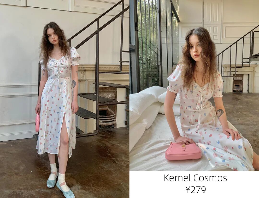 新鮮出爐的小兔子印花開衩連衣裙,美的特別夢幻,法式方領遇到抽繩設計後變成了有點小性感的雞心領。
