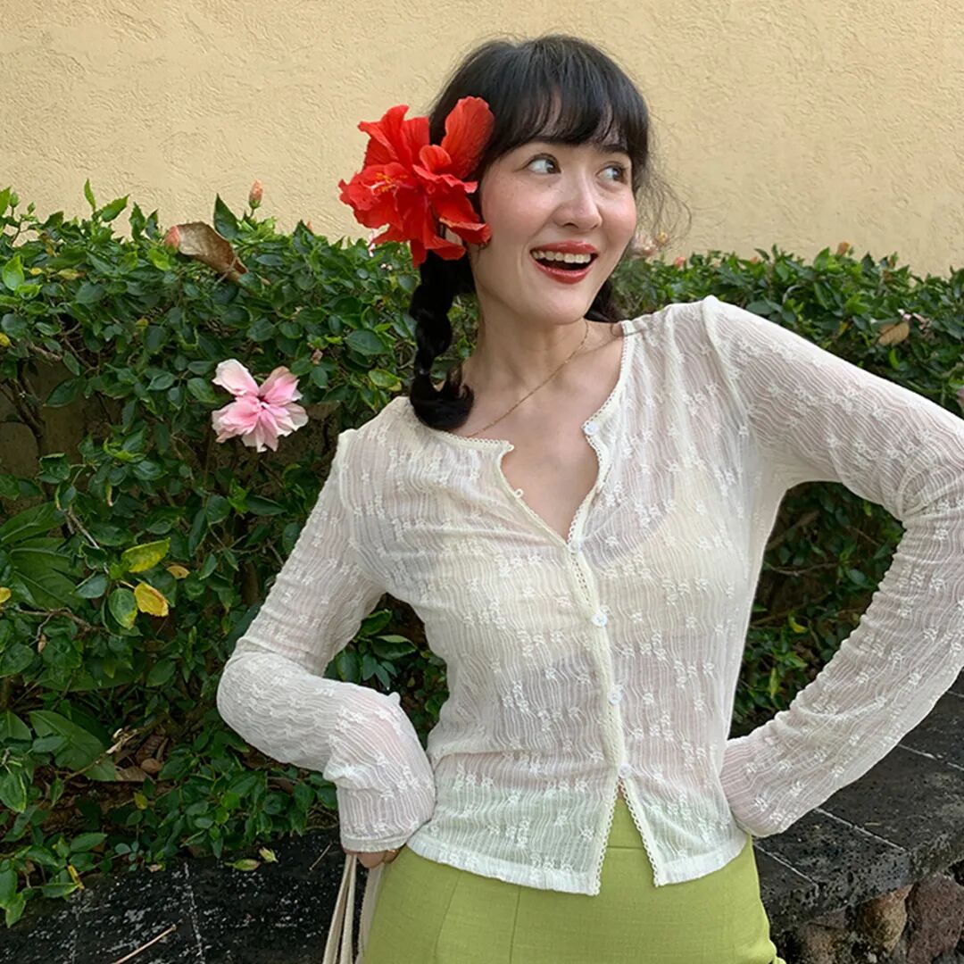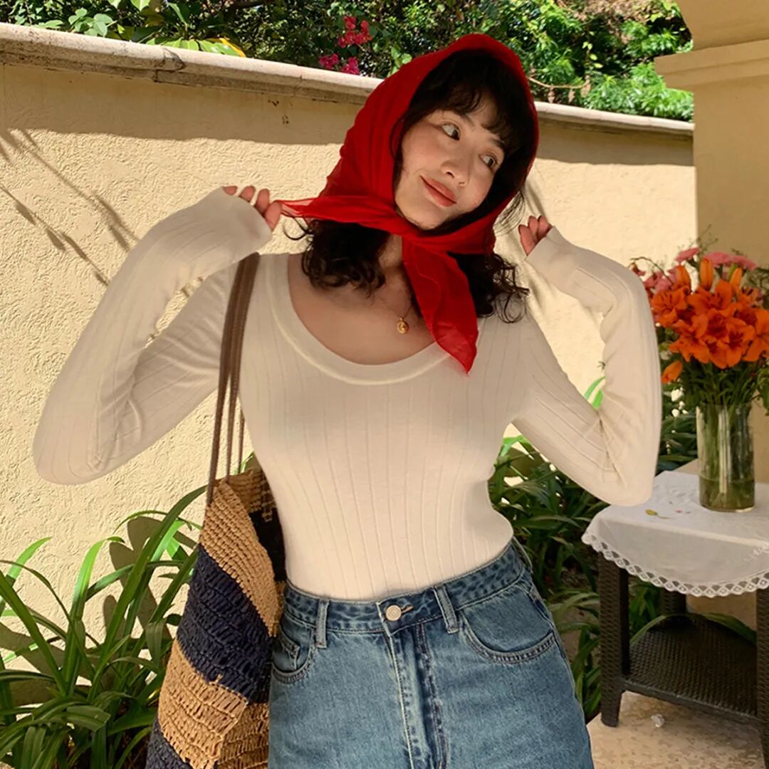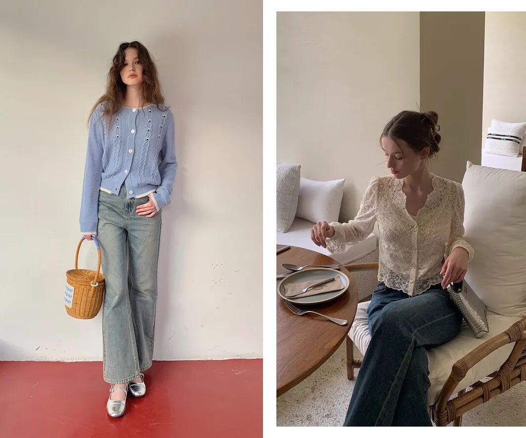 法式風還必須要擁有的,就是修身針織了。她們會配牛仔褲,或是圍裹半裙。幫你們找了幾件,先來說說精緻又能凹造型的網紗打底衫。