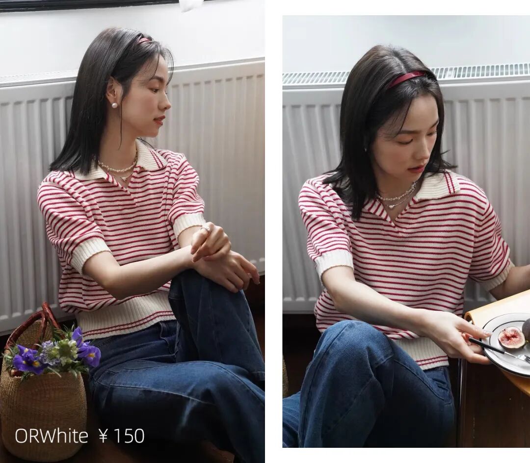 還有紅色條紋上衣,本身就很法式,春天還可以穿在西裝裡面。