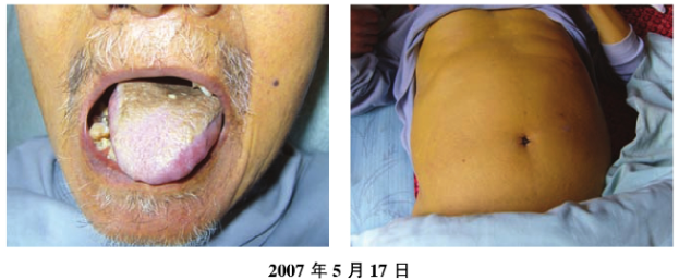 2007年5月17日複診:患者半臥於床,下床活動困難,全身黃染加重,呈蠟黃色,胃腕脹滿不適,脅肋脹痛,膝蓋以下發涼,食慾欠佳,便秘尿少,晝睡夜醒,下腹膨隆,血管顯現,呈青紫色,腹水症(+++),腹部包塊增大質硬,痛不可觸,下腹部壓痛,舌質紫暗,瘀斑明顯,苔黃燥,脈弦緊。告知患者病危,建議住院治療,患者拒絕。