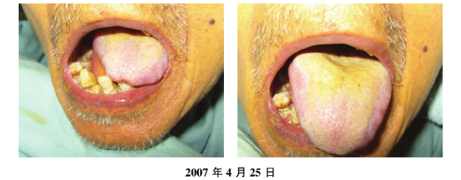 2007年4月25日複診:便秘尿黃、全身黃染、脅肋脹痛輕,納可,寐差,舌質紫暗瘀斑點,舌苔厚膩,舌下絡脈紫粗曲張。繼用芮陳溫膽湯加減治療。