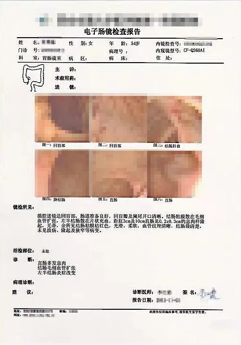 一份合格的腸鏡報告,除了個人信息欄以外,一般配有4張或以上的內鏡圖像,然後附有具體的鏡檢描述,以及最終的診斷結果,有時會註明是否取病理活檢以及活檢部位和數量。
