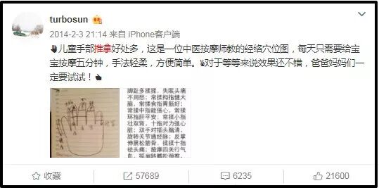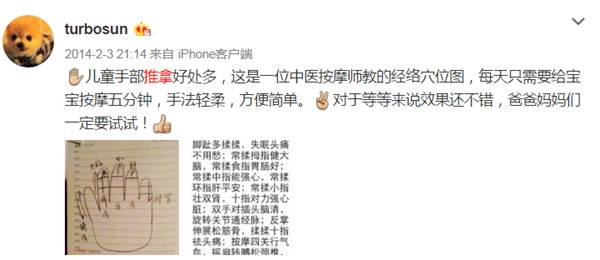 素來有養生出名的孫儷,在很久以前,就曾在微博分享過這個“讓孩子少生病的秘方”——小兒推拿