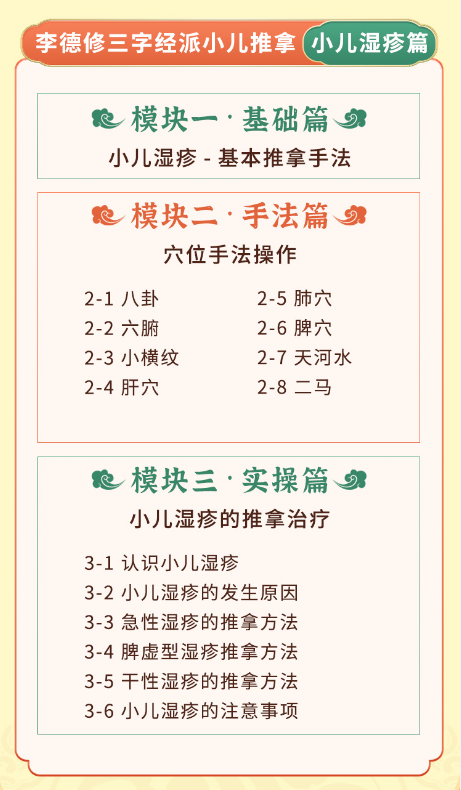 李德修三字經派小兒推拿,多采用獨穴治療小兒疾病,取穴少且精準,高清視頻教學,推拿動作精講,消除不會按、不敢按的難題,0基礎掌握取穴、推拿方法。