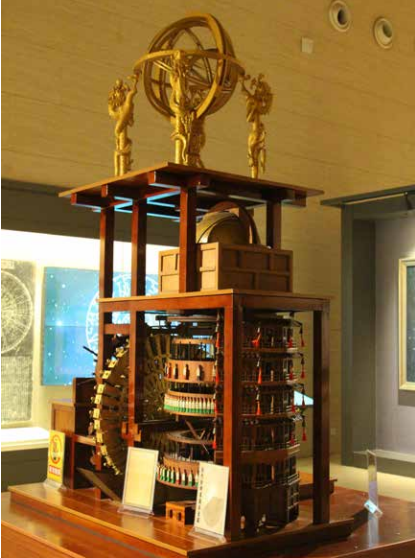 水運儀象臺(1:4 大小的復原模型),現藏開封市博物館。據推算,其實際高度在 8.73—8.82 米之間,為上窄下寬長方形木構建築,按集渾儀、渾象及報時功能分為三層,是宋代天文儀器巔峰之作