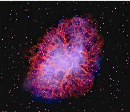 約2014年,西班牙拉帕爾馬天文臺利物浦望遠鏡拍攝到的蟹狀星雲圖像。《宋會要》記載的宋仁宗年間“客星”的出現,是人類記錄下的第一次有明確時間的超新星爆發,而它留下的遺蹟“蟹狀星雲”,一直都是被研究最多的太空目標之一