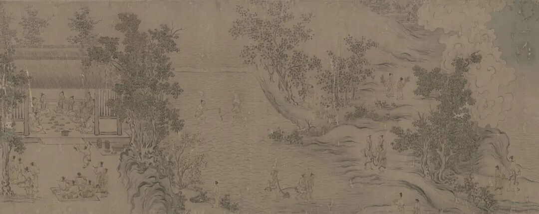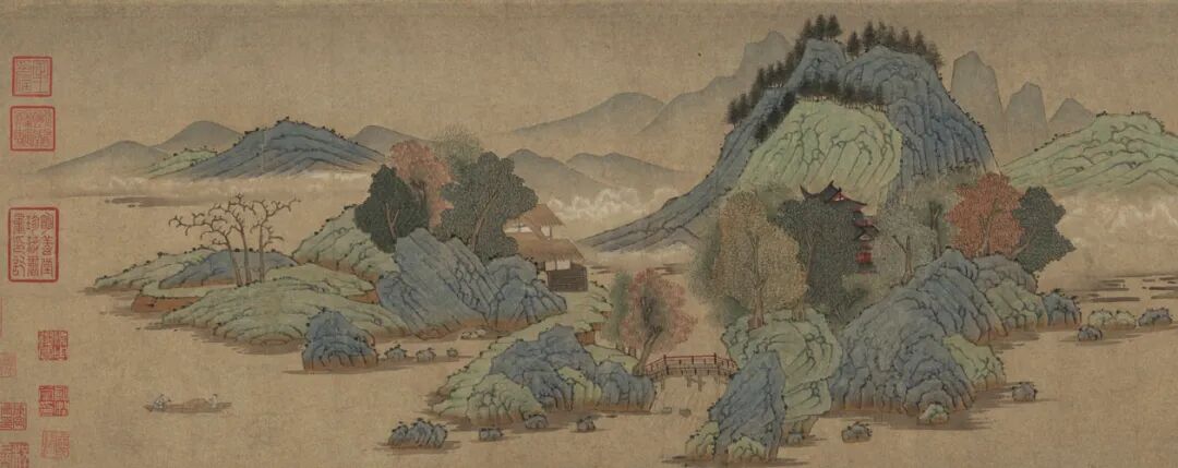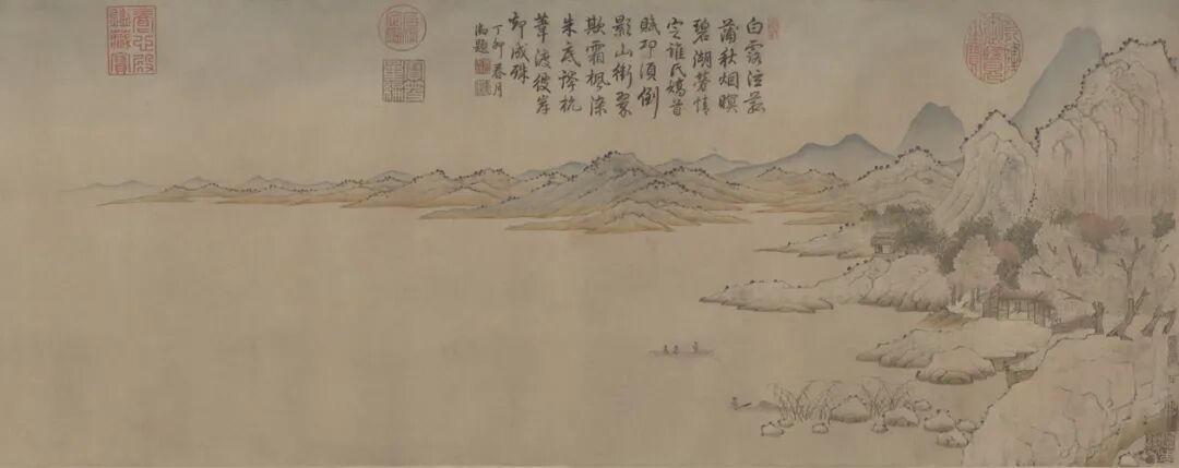 錢選《秋江待渡圖》卷,紙本設色,26.8×108.4cm,元,藏於故宮博物院,經高士奇遞藏