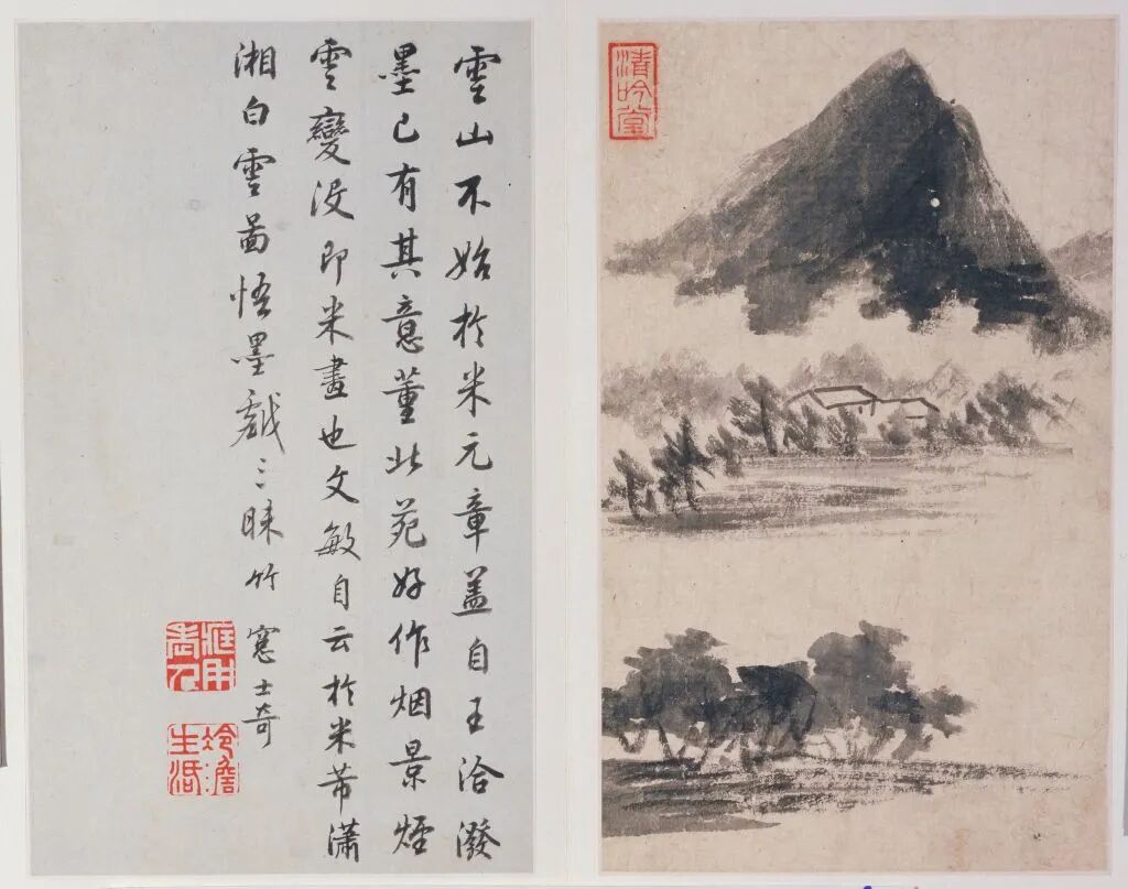 董其昌《山水》冊(其一),紙本墨筆、設色,26.4×16cm,明,藏於故宮博物院,高士奇題跋