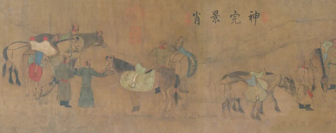 傳胡瓌《卓歇圖》卷,絹本設色,33×256cm,五代,藏於故宮博物院,高士奇題跋
