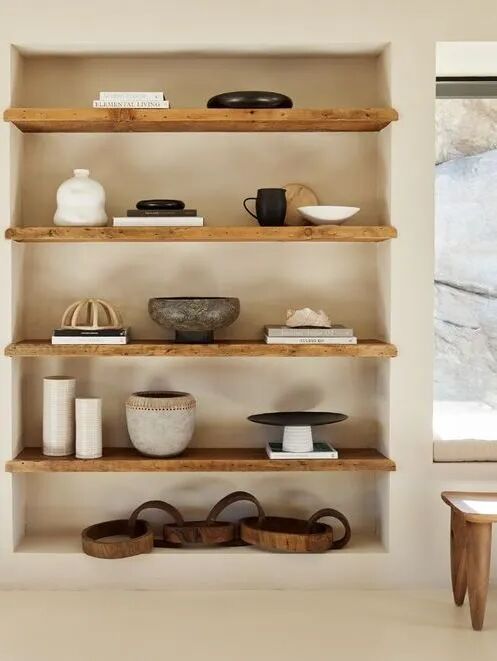 你可以利用木質桌椅打造一個自然舒適的餐廳,容納多人用餐的同時更具交流感;或者用木質擱板在牆面進行物品陳列,不僅增添趣味性,還巧妙完成收納需求;又或者做個矮腳茶几,圍合式打造一圈座椅,與好友們聚會暢聊,都是不錯的空間設計方案~