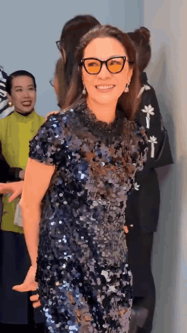 影后楊紫瓊身穿紫色亮片連衣裙搭配貓眼墨鏡,笑容明媚,氣場超強,盡顯優雅知性獨特魅力。