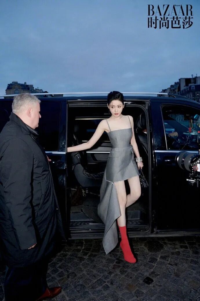 張天愛身著灰色不規則緊身吊帶裙勾勒名品身材,搭配紅絲絨長靴,冷豔颯爽,高貴又惹眼。