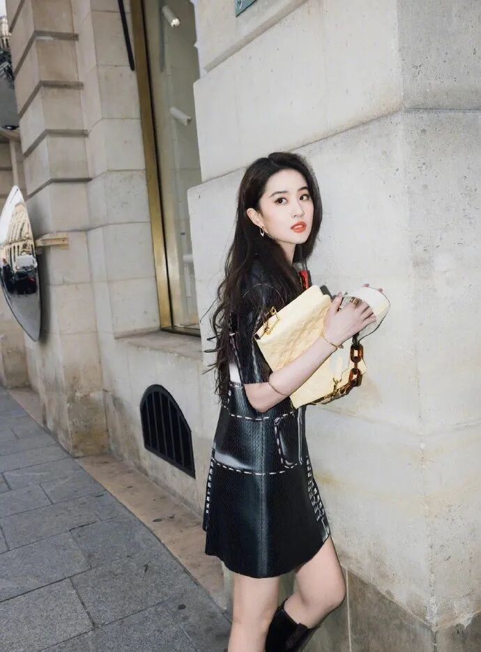 劉亦菲一身機械風皮裙搭配長靴酷颯十足,搭配嫩黃色方包,增添溫柔質感,時尚之力一整個拉滿!