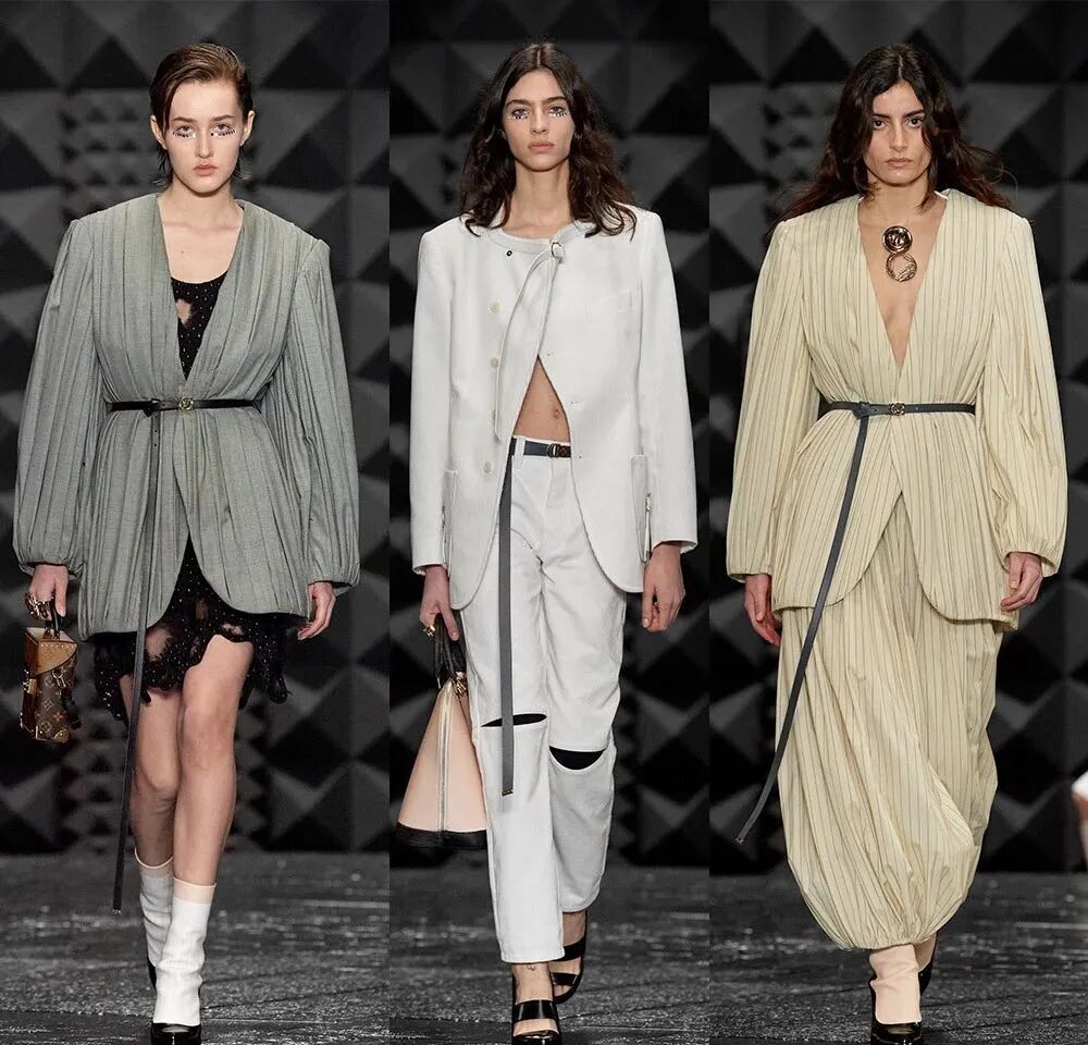 Louis Vuitton 2023秋冬系列弧線的剪裁線條,幹練的西裝,皮革材質結合,以及復古紋理印花,使本季大秀充滿了前衛,摩登又不失文藝氣質。