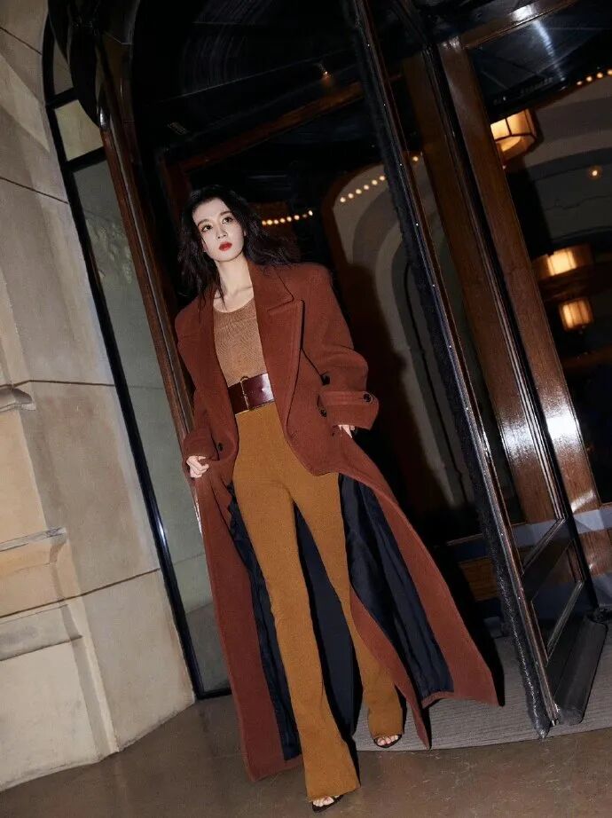 王楚然棕色毛呢大衣搭配同色系內搭,清冷大氣,美豔高貴的富家千金即視感;