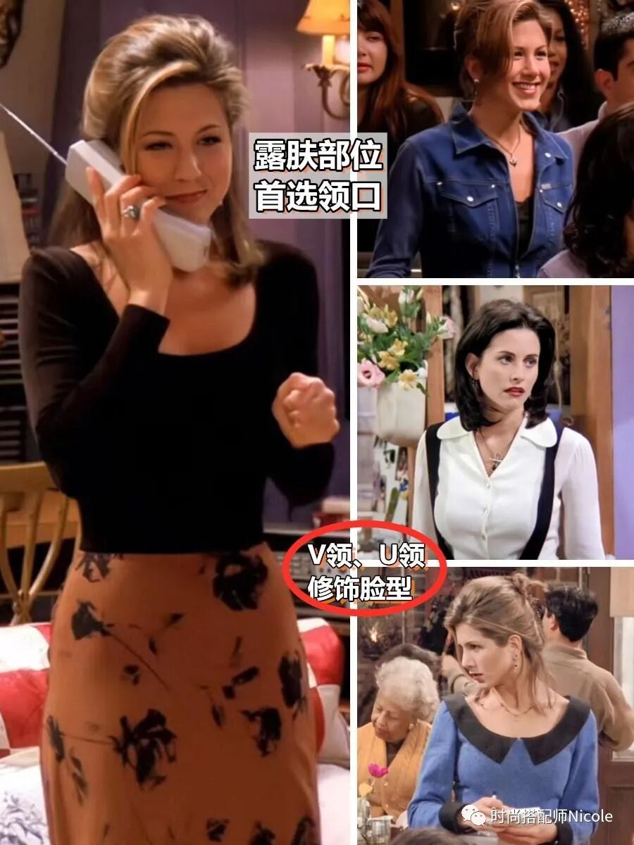 每看一次《老友記》,都讓我更深刻的體會到“領子選對,時髦加倍”!三美們是真的會用領口露膚來給基礎款穿搭“加戲”,用V字形或者U型領口的針織衫,來凸顯自己的身材優勢,顯瘦之餘還更有風情。