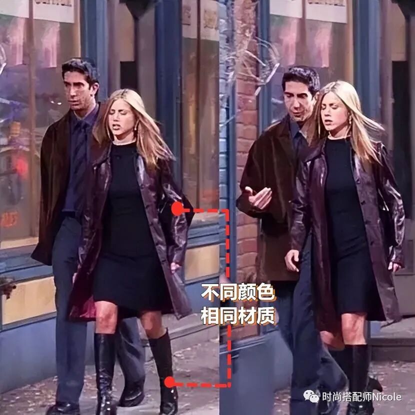 更妙的是!劇中還會在不同色彩裡用相同材質來呼應,黑色皮靴和紅棕色皮衣的組合,完全打開了色彩搭配的思路