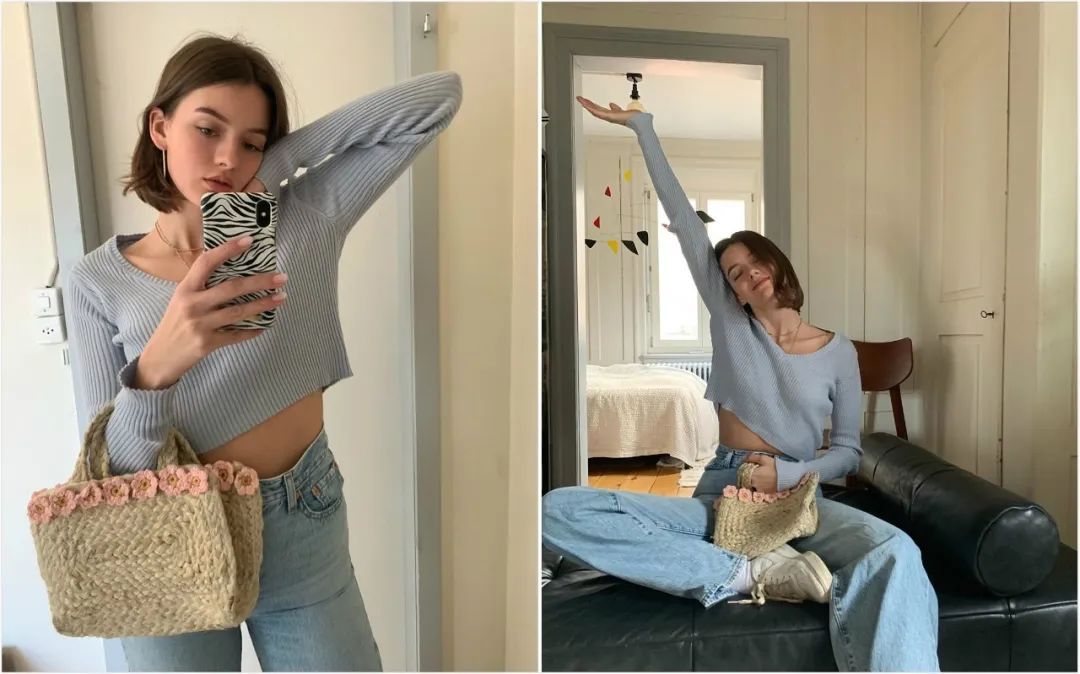 無論是長袖、短袖,闊腿牛仔褲都像一個背景板,襯托出一股子簡約高級感。
