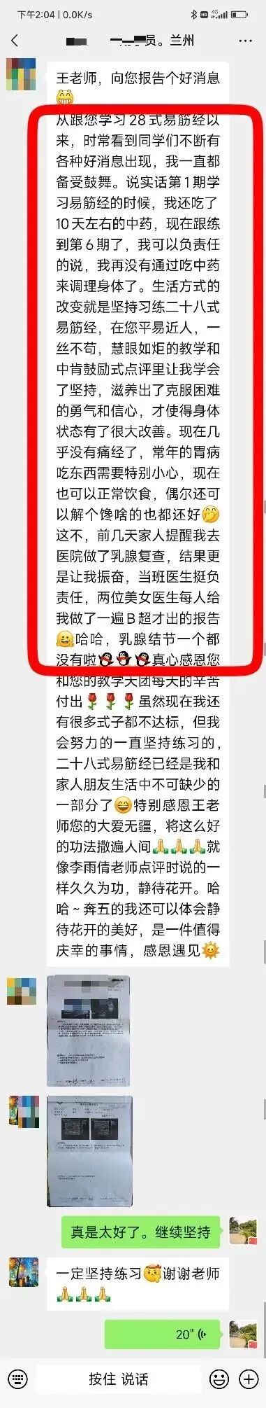 2005年以來,王老師開始在推廣、傳播易筋經,至今已有不少人跟隨王老師練習並改善了身體,如鼻炎、心血管病、不孕不育、痛經等。