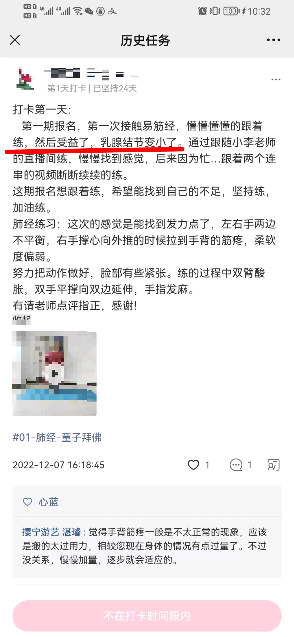 第一位小夥伴,每期都會複訓,練習半年多,不僅乳腺結節完全沒有了,還有其他驚喜:原本體質差,要靠吃中藥調理,現在丟掉藥罐子了,老毛病胃病、痛經等也都好了。