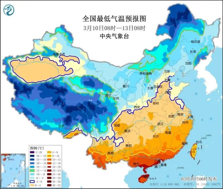 受寒潮影響,預計,3月10日08時至3月13日08時,中東部大部地區氣溫下降6~10℃,內蒙古、華北、黃淮、江淮東部等地氣溫下降12℃,局部超過16℃,上述地區先後有4~6級風,陣風7~9級。我國近海大部海域有6~8級風,陣風9~11級。過程最低氣溫出現在13日早上,最低氣溫0℃線將位於陝西南部、河南西部、河北南部到天津一線,山東東部和江蘇東北部最低氣溫也將達到0℃左右。