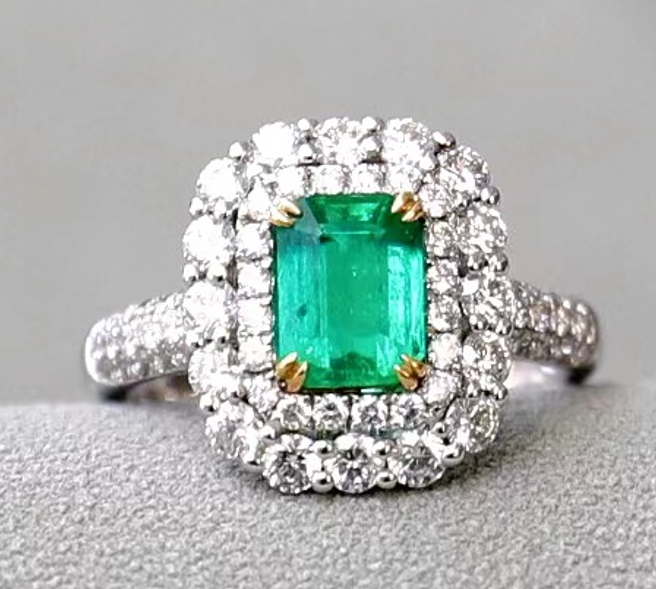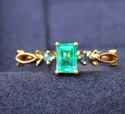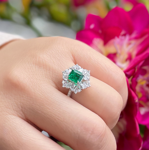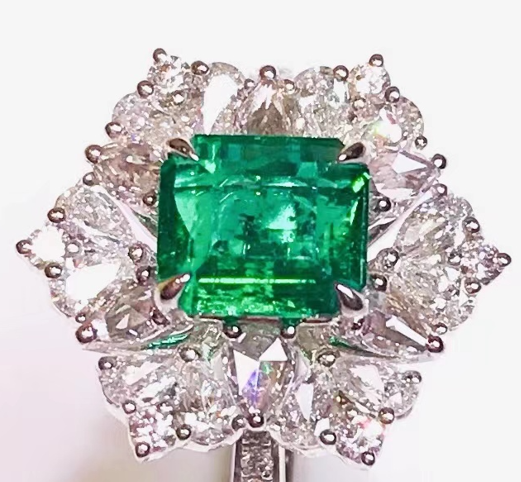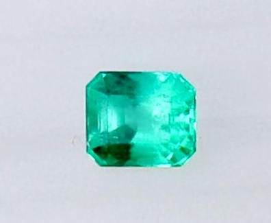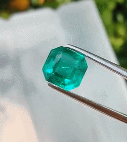 祖母綠方蛋面,綠中微帶藍色調,清新明亮通透。略帶藍色的翠綠祖母綠,是哥倫比亞祖母綠的典型特徵,是一種獨有的美麗