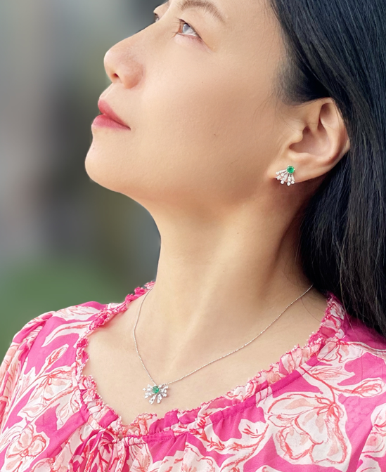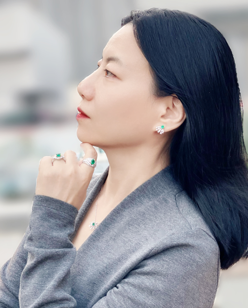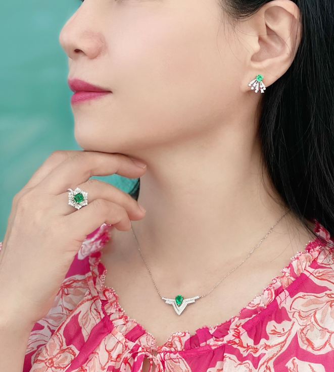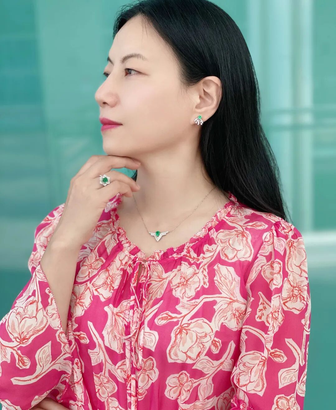 祝萍精心選出色彩亮麗、淨度高、包裹體少的高品質祖母綠蛋面,做了輕奢設計,將古典與現代相結合,中西合璧。