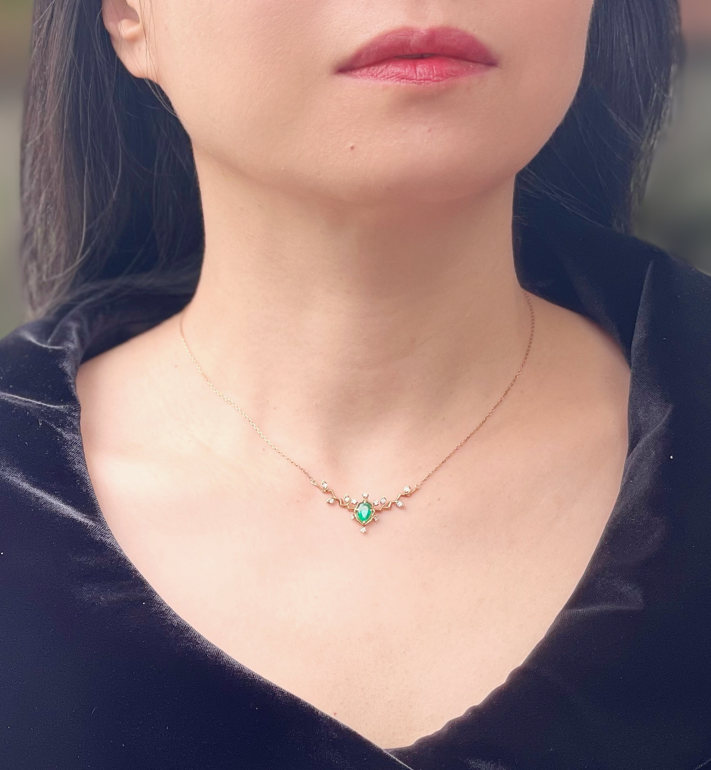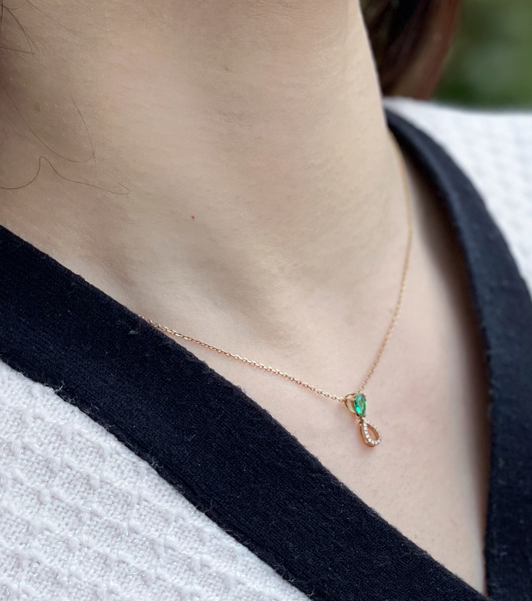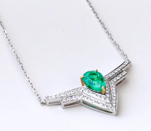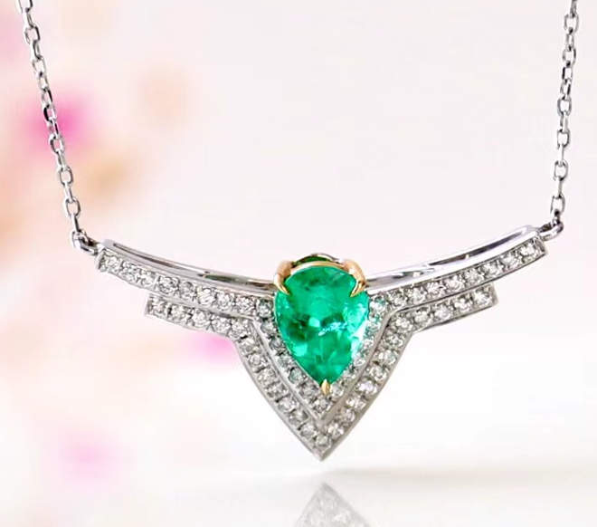水滴形切面祖母綠,綠色嬌嫩,火彩閃耀,非常簡潔的設計,簡約中卻透著精緻、靈動。
