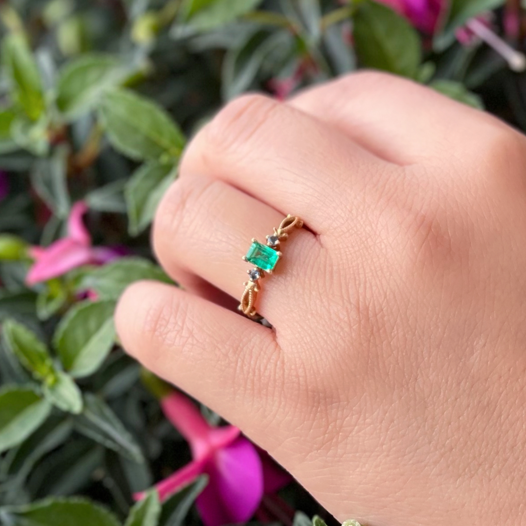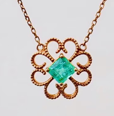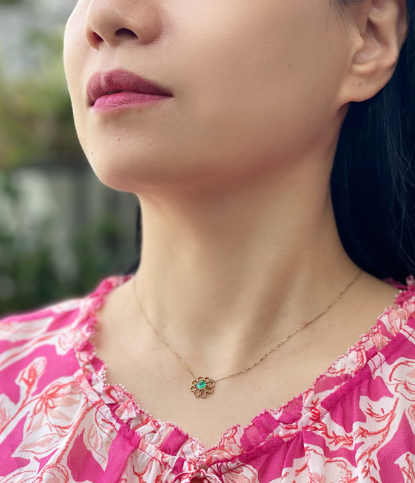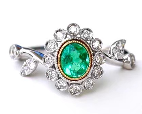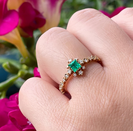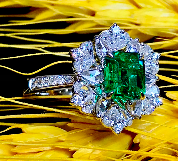 金色珠邊製作成花形,環繞著一顆綠色泛藍色調的哥倫比亞祖母綠寶石,如花朵綻放,帶來更大更多的開心與幸福。