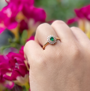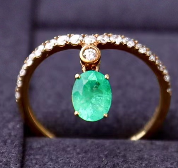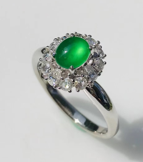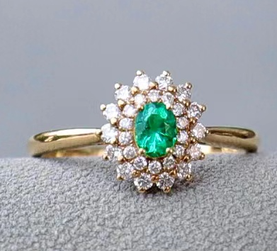 顏色濃綠的橢圓形的祖母綠小蛋面,用高淨度鑽石圍鑲2圈,設計成盛開的花瓣,盡顯祖母綠花園般的特質,黃k金襯托,經典華貴,方便日常佩戴,彰顯品位。