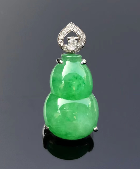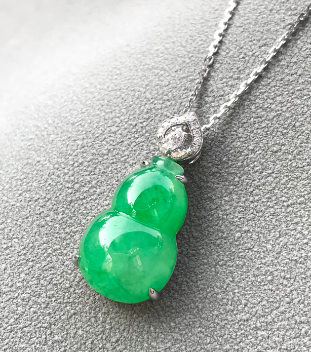 冰種帶翠葫蘆,飽滿厚實,質地細膩潤澤,翠根多翠色嬌嫩