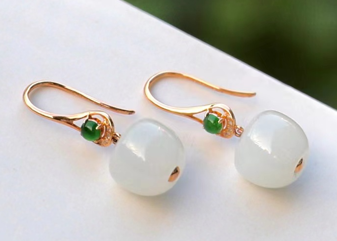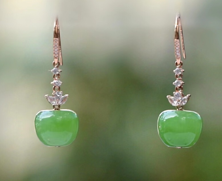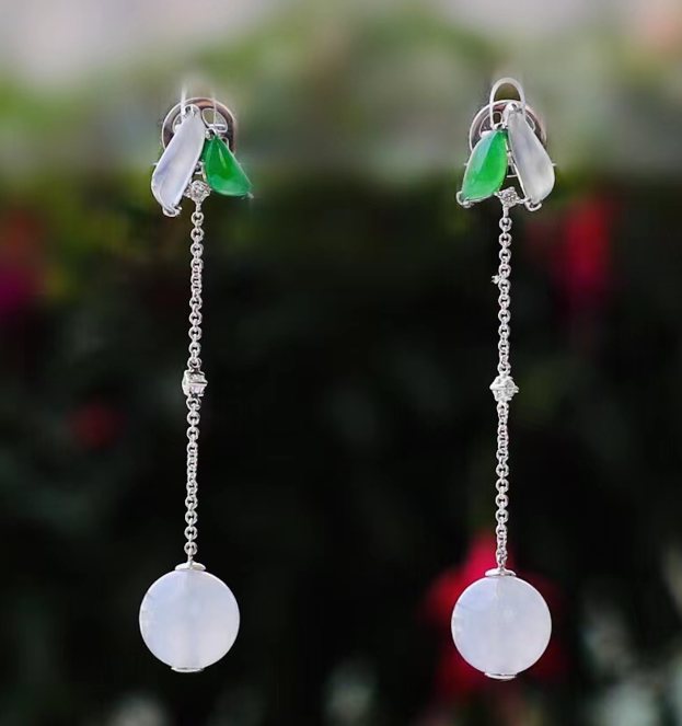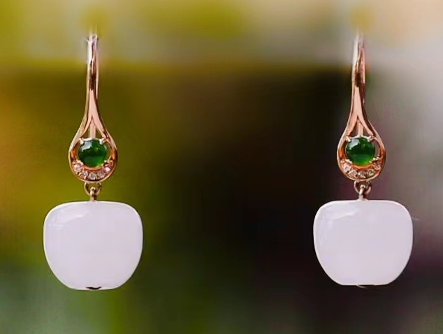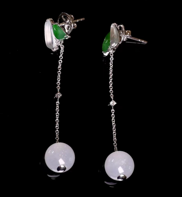 白玉蘋果珠耳墜,潔白瑩潤,細膩如脂。精選冰陽綠翡翠,與白玉相互點綴,青春靚麗,華麗優雅。