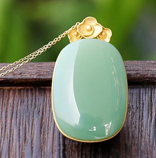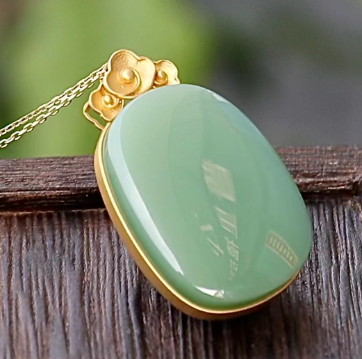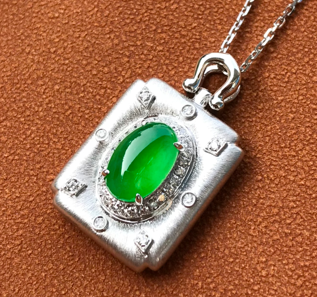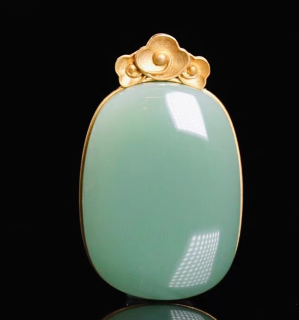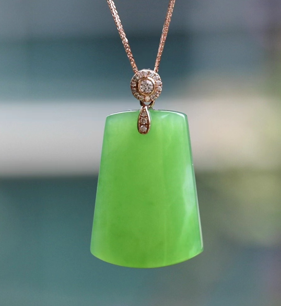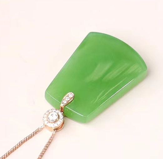 玉牌打磨圓滑,鑲k金配鑽圓扣頭,“天圓地方”,簡潔精美,又不失大氣。款型厚薄適中,似梯形,少了正方的“硬”,給人一種獨特的知性美,彰顯個性魅力。