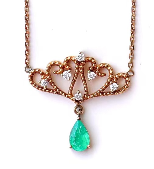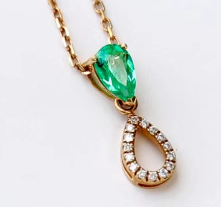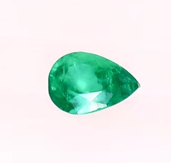 這顆水滴形祖母綠,重量超過1.0克拉,色澤明亮,晶瑩通透無瑕,光澤閃耀呈豔綠色,微油