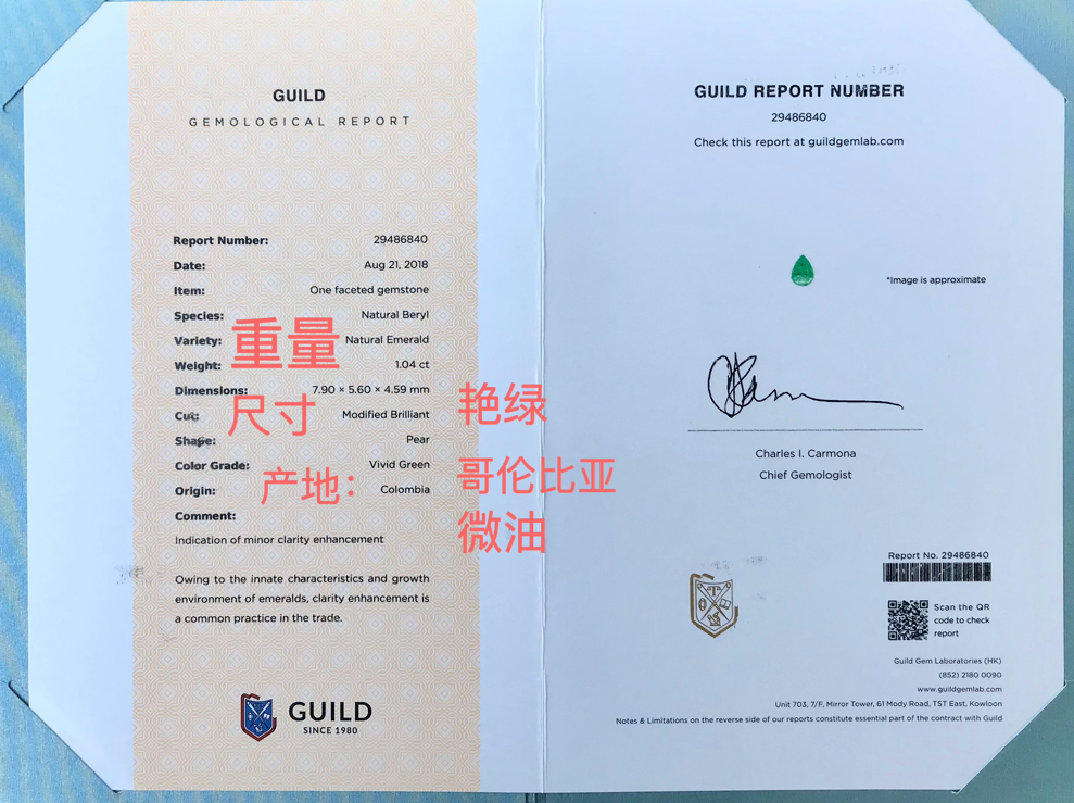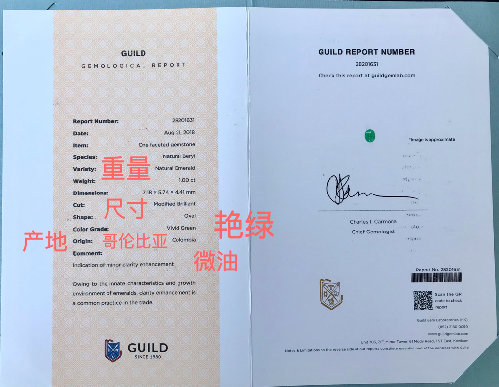 附帶英文國際證書——吉爾德證書。美國GUILD(吉爾徳)寶石實驗室,源自美國,成立於1980年,由知名寶石學家Mr.Charles Carmona創立,一直致力於彩色寶石的鑑定研究。以38年的歷史,專業的知識,給您優質的保障。