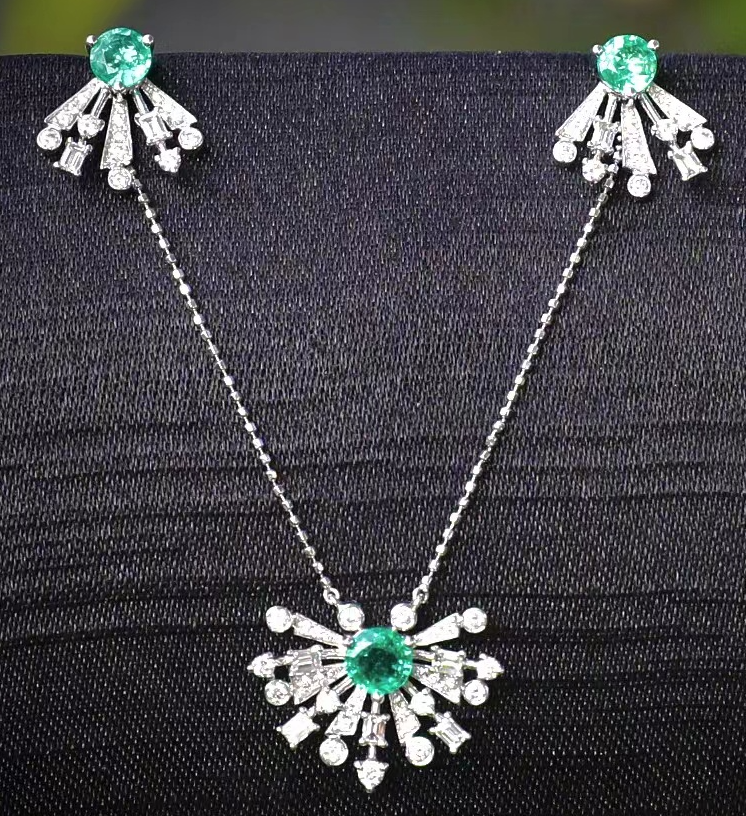 高品質鑽石鑲嵌的祖母綠套鏈、耳釘兩件套,融合18K金的設計,將古典優雅和現代簡約感結合起來,璀璨奪目,奢華貴氣