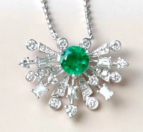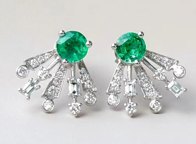 淨透明亮圓形切面祖母綠,切工完美,寶石光澤閃耀,綠色中帶藍色調,透著神秘冷豔高貴的氣息。